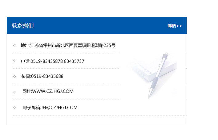 地址:常州市新北區友邦商務大廈1幢16、17層  電話:0519-85101652  傳真:0519-85112595  郵編:213022  網址:www_cz-jiayue_cn.bj-brw.com  郵箱:xiajifengaa@163.com